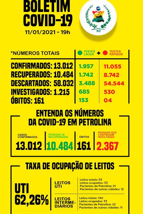 A taxa de ocupação geral dos leitos de UTI da rede é de 62,26%. Dos 53 leitos disponíveis, 33 estão ocupados, sendo 21 pacientes de Petrolina e 12 de outras cidades da região. Os dados completos seguem em anexo. Todas as informações sobre a pandemia na cidade também estão disponíveis no site da prefeitura.