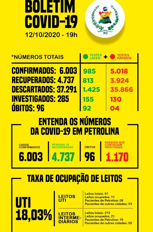 A taxa de ocupação geral dos leitos de UTI da rede pública é de 18,03%. Dos 61 leitos disponíveis, 11 estão ocupados, sendo 8 por pacientes de Petrolina e 3 por aqueles de outras cidades da região. Os dados completos podem ser acessados pelo link.