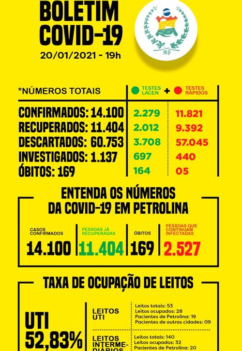 A taxa de ocupação geral dos leitos de UTI da rede é de 52,83%. Dos 53 leitos disponíveis, 28 estão ocupados, sendo 19 por pacientes de Petrolina e nove por aqueles de outras cidades da região. Os dados completos podem ser acessados pelo link. Todas as informações sobre a pandemia na cidade também estão disponíveis no site da prefeitura.