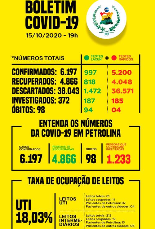 Mais um óbito por Covid-19 também foi registrado, totalizando agora 98. Trata-se de uma idosa, de 63 anos, que estava internada em um hospital público no Recife. Ela tinha histórico de outras doenças e faleceu no dia 18 de agosto, mas a Declaração de Óbito (DO) só chegou à Vigilância em Saúde de Petrolina nesta quinta.