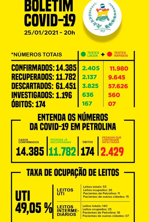 A taxa de ocupação geral dos leitos de UTI da rede é de 49,05%. Dos 53 leitos disponíveis, 26 estão ocupados, sendo 11 por pacientes de Petrolina e 15 por aqueles de outras cidades da região. Os dados completos podem ser acessados pelo link. Todas as informações sobre a pandemia na cidade também estão disponíveis no site da prefeitura.