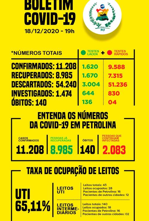 A taxa de ocupação geral dos leitos de UTI da rede pública é de 65,11%. Dos 43 leitos disponíveis, 28 estão ocupados – sendo 16 por pacientes de Petrolina e 12 por aqueles de outras cidades da região. Os dados completos podem ser acessados pelo link. Todas as informações sobre a pandemia na cidade também estão disponíveis no site da prefeitura.
