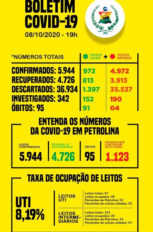 Do total geral de diagnosticados, 4.726 (79,5%) já estão recuperados – um acréscimo de mais 95 curas clínicas. Petrolina continua com 95 óbitos por covid-19.