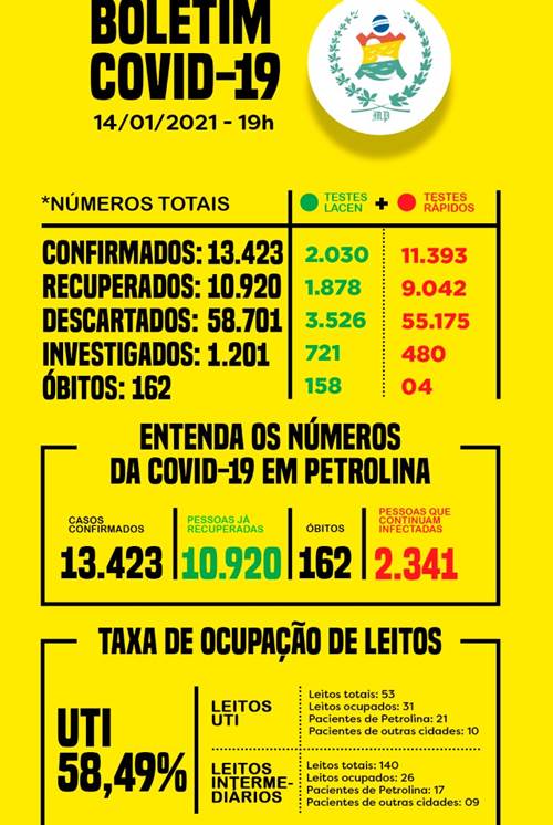 A taxa de ocupação geral dos leitos de UTI da rede é de 58,49%. Dos 53 leitos disponíveis, 31 estão ocupados, sendo 21 por pacientes de Petrolina e 10 por aqueles de outras cidades da região. Os dados completos podem ser acessados pelo link. Todas as informações sobre a pandemia na cidade também estão disponíveis no site da prefeitura.