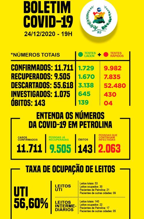 A taxa de ocupação geral dos leitos de UTI da rede pública é de 56,60%. Dos 53 leitos disponíveis, 30 estão ocupados, sendo 21 por pacientes de Petrolina e 9 por aqueles de outras cidades da região. Os dados completos podem ser acessados pelo link. Todas as informações sobre a pandemia na cidade também estão disponíveis no site da prefeitura.