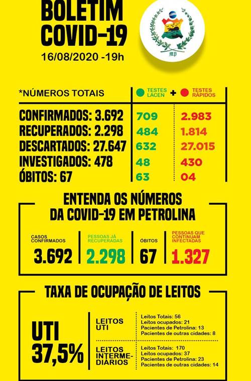 Houve mais dois óbitos por Covid-19, chegando a 67. Ambos correram neste sábado (15). São dois homens, de 53 e 69 anos. O primeiro foi em um hospital da rede pública de Juazeiro (BA) e o segundo em uma unidade de saúde da rede particular de Petrolina.