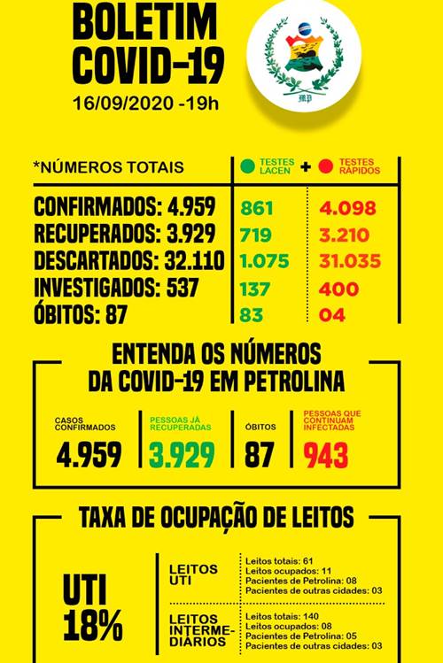 Petrolina confirmou no boletim desta quarta-feira (16) da Secretaria Municipal de Saúde (SMS) o total de 4.959 casos positivos do novo coronavírus (Covid-19). São 87 diagnosticados com a doença nas últimas 24 horas, sendo 74 através dos 342 testes rápidos realizados pela gestão municipal e 13 por exames laboratoriais.