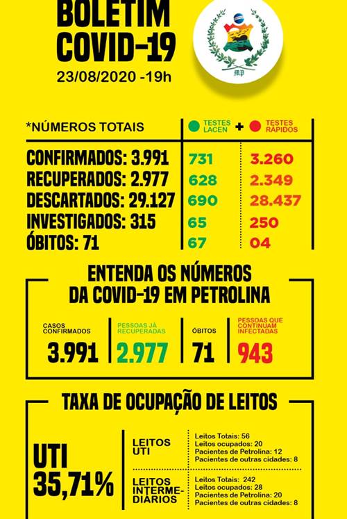 Petrolina segue com os 3.991 casos confirmados do novo coronavírus (Covid-19), sem alterações nas últimas 24 horas, segundo o boletim epidemiológico da Secretaria Municipal de Saúde (SMS). Do total de infectados até o momento, 3.260 foram por testes rápidos da prefeitura e 731 diagnosticados através de exames laboratoriais. O município tem 2.977 curas clínicas e 71 óbitos registrados.