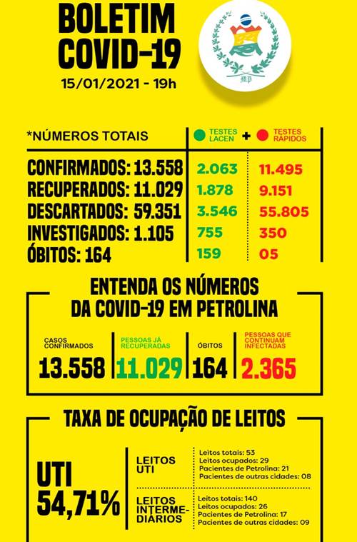 A taxa de ocupação geral dos leitos de UTI da rede é de 54,71%. Dos 53 leitos disponíveis, 29 estão ocupados, sendo 21 por pacientes de Petrolina e oito por aqueles de outras cidades da região. Os dados completos pode ser acessados pelo link. Todas as informações sobre a pandemia na cidade também estão disponíveis no site da prefeitura.