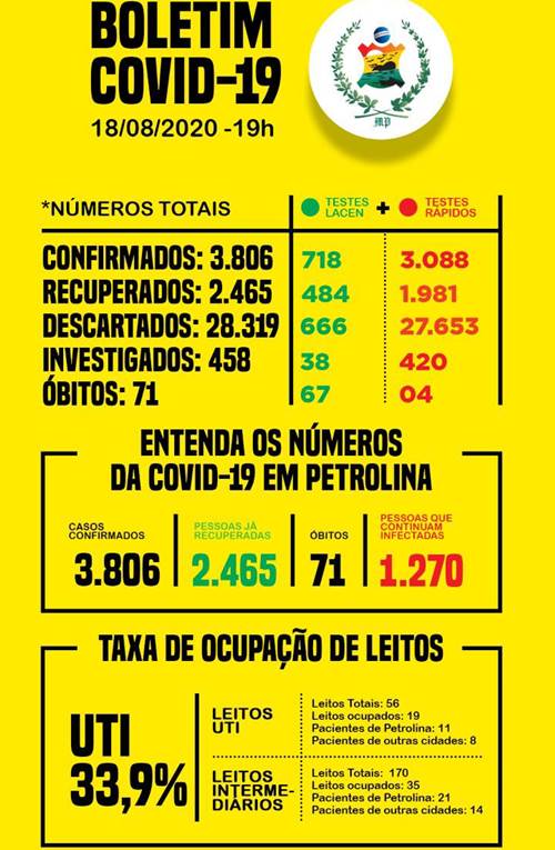 Petrolina teve também mais dois óbitos por Covid-19, ambos ocorridos ontem (17). Os pacientes eram um homem de 79 anos e uma mulher, de 37 – ambos com comorbidades. O idoso faleceu em um hospital privado de Petrolina, enquanto a paciente veio a óbito em uma unidade da rede pública de Juazeiro (BA). Agora, já são 71 os mortos pela doença.