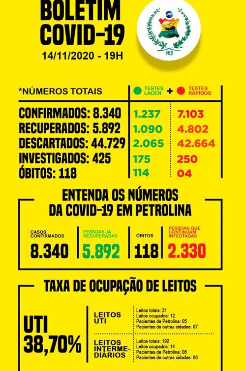 Petrolina teve também mais um óbito por Covid-19, totalizando 118. Trata-se de um idoso, de 91 anos, com histórico de outras doenças. Ele estava internado em um hospital da rede privada e faleceu nesta sexta-feira (13).