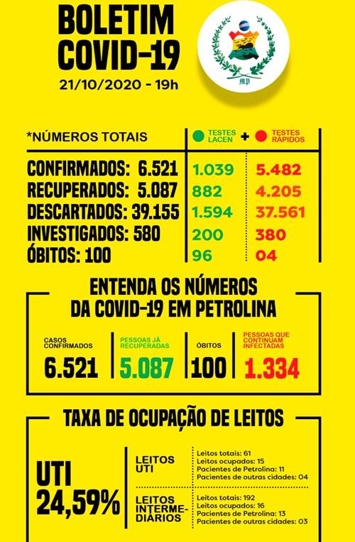 Por outro lado, Petrolina confirmou o 100º óbito pela doença. Trata-se de um idoso, de 82 anos, com histórico de outras doenças, que estava internado em um hospital da rede privada da cidade e faleceu nesta quarta-feira.