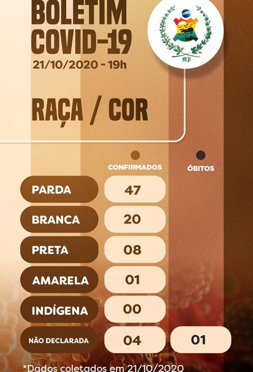 Os dados referentes à raça/cor/etnia dos novos casos positivos que constam no boletim seguem abaixo. A relação é feita de acordo com as categorias do Instituto Brasileiro de Geografia e Estatística (IBGE): branca, preta, parda, amarela, indígena.