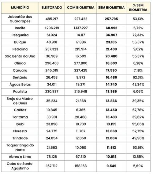 Um dos principais objetivos do mutirão é ampliar a coleta biométrica do eleitorado. Atualmente, Pernambuco tem 989.454 eleitoras e eleitores sem registro biométrico, equivalente a 14,02% do eleitorado total, que é de 7.055.348, conforme dados atualizados em 1º de outubro deste ano. Entre os municípios pernambucanos com maior número de eleitores sem biometria coletada, quem encabeça a lista é Jaboatão dos Guararapes, na Região Metropolitana, segundo maior colégio eleitoral do Estado. Dos 485.217 eleitoras e eleitores do município, 53,13% (257.795) não realizaram a coleta biométrica. Principal cidade do Sertão, Petrolina tem apenas 9,02% de eleitores sem biometria – ou seja, 21.409 eleitores de um total de 237.323. Destes, 215.914 fizeram o cadastramento biométrico (confiram o quadro abaixo).