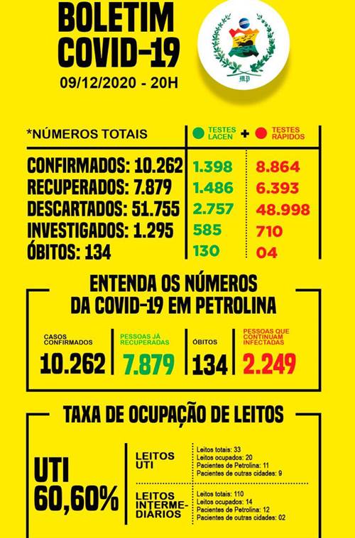A taxa de ocupação geral dos leitos de UTI da rede pública é de 60,60% nesta quarta. Dos 33 leitos disponíveis, 20 estão ocupados – sendo 11 por pacientes de Petrolina e 9 por aqueles de outras cidades da região. Os dados completos podem ser acessados pelo link. Todas as informações sobre a pandemia na cidade também estão disponíveis no site da prefeitura.