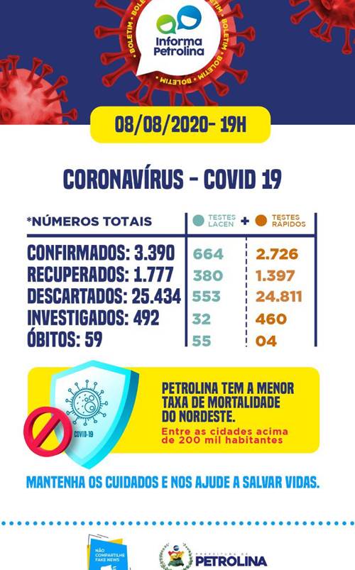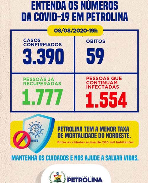 A boa notícia é que, além de mais 30 curas clínicas, pelo segundo dia consecutivo Petrolina não registrou nenhuma morte pela Covid-19, continuando com 59 óbitos. Até o momento são 1.777 recuperados, representando 52,4% do total de casos confirmados