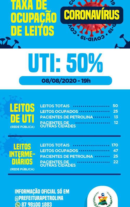 A taxa de ocupação geral dos leitos de UTI da rede pública é de 50%. Dos 50 leitos disponíveis, 25 estão ocupados, sendo que 13 pacientes são de Petrolina e 12 de outras cidades da região. Os dados completos podem ser conferidos pelo link.
