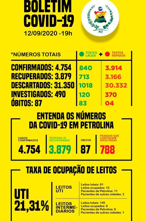 Do total geral de confirmados, 3.879 pessoas já estão recuperadas. Esse quantitativo representa 81,6% dos casos. Dos positivados, 3.914 foram por testes rápidos da prefeitura e 840 diagnosticados através de exames laboratoriais. Petrolina tem 87 óbitos por covid-19.