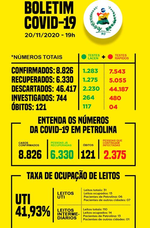A taxa de ocupação geral dos leitos de UTI da rede pública reduziu de 45,16% na quinta-feira para 41,93% nesta sexta. Dos 31 leitos disponíveis, 13 estão ocupados, sendo 6 por pacientes de Petrolina e 7 por aqueles de outras cidades da região. Os dados completos podem ser acessados pelo link.