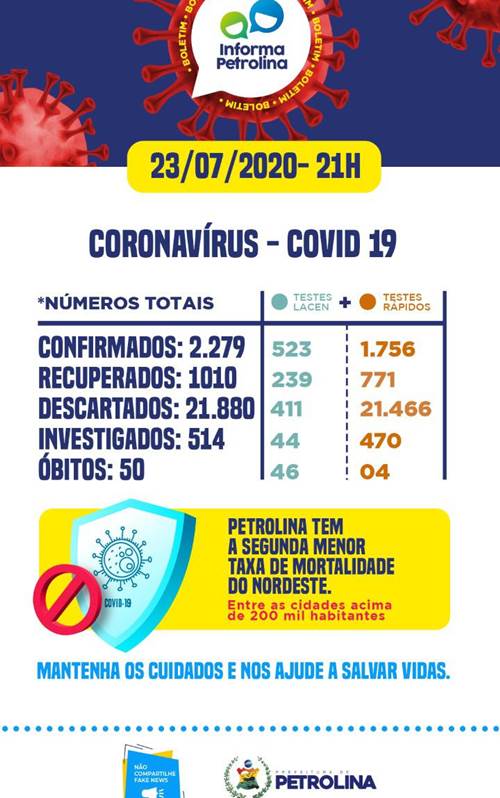 A SMS recebeu dois exames do Laboratório Central de Pernambuco (Lacen-PE) confirmando Covid-19 em duas pessoas que morreram nos dias 17 e 18/07, em uma unidade de saúde da rede pública. Eram dois homens – um de 44 e outro de 85 anos, ambos sem histórico de comorbidades. Com isso, o total de óbitos subiu para 50.