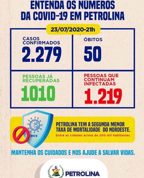 Mais 74 casos confirmados do novo coronavírus (Covid-19) foram registrados pela Prefeitura de Petrolina nesta quinta-feira (23). Desse número, 54 diagnósticos vieram de 465 testes rápidos realizados pela Secretaria Municipal de Saúde (SMS) e os outros 20 por meio de exames laboratoriais. Agora, conforme o boletim atualizado, o número total no momento é de 2.279 infectados. Destes, 188 são detentos da Penitenciária Dr. Edvaldo Gomes (PDEG).