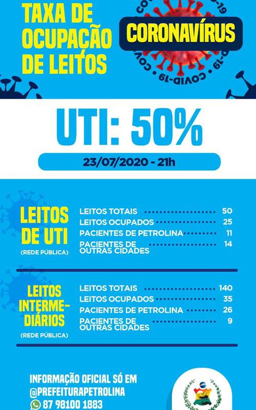 A taxa de ocupação geral dos leitos de UTI da rede pública é de 50%. Dos 50 leitos disponíveis, 25 estão ocupados, sendo que 11 pacientes são de Petrolina e 14 de outras cidades da região. Os dados completos podem ser acessados pelo link.