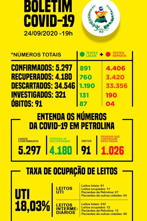 Do total de casos até o momento, segundo a Secretaria Municipal de Saúde (SMS), 4.406 foram confirmados por testes rápidos da prefeitura e 891 diagnosticados através de exames laboratoriais. Petrolina teve mais dois óbitos por Covid-19, totalizando 91. Eram dois homens – um de 54 anos e outro de 57. O primeiro faleceu nesta quarta (23), em um hospital particular da cidade, enquanto o segundo veio a óbito nesta quinta, em uma unidade da rede pública. Apenas o paciente de 54 anos tinha histórico de outras doenças.