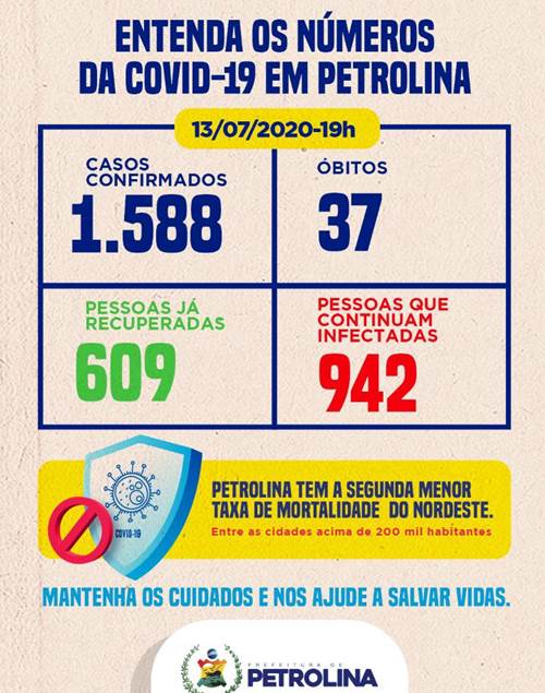 Do total de positivados, 1.222 foram confirmados por testes rápidos da prefeitura e 366 diagnosticados através de exames laboratoriais. As curas clínicas aumentaram para 609. Petrolina recebeu um exame do Laboratório Central de Pernambuco (Lacen-PE) confirmando Covid-19 em um paciente de 67 anos, que faleceu no Hospital Universitário (HU) no último dia 9 de julho. Agora, o total de óbitos subiu para 37.