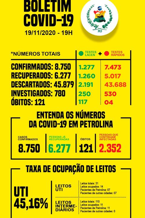 O município manteve os 121 óbitos pela doença até o momento. A prefeitura aguarda o resultado da análise do material biológico que foi coletado de uma pessoa do sexo feminino, de 54 anos, com histórico de comorbidades, que faleceu nesta quarta-feira (18) em um hospital da rede pública de Petrolina. O óbito foi notificado como Síndrome Respiratória Aguda Grave (SRAG).