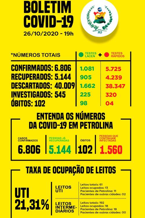 Por testes da prefeitura já foram confirmados 5.725 casos, enquanto 1.081 foram diagnosticados através de exames laboratoriais. Petrolina teve também mais um óbito por Covid-19, totalizando 102. O paciente – um idoso de 79 anos, com histórico de outras doenças – estava internado em um hospital da rede pública e faleceu neste domingo (25).