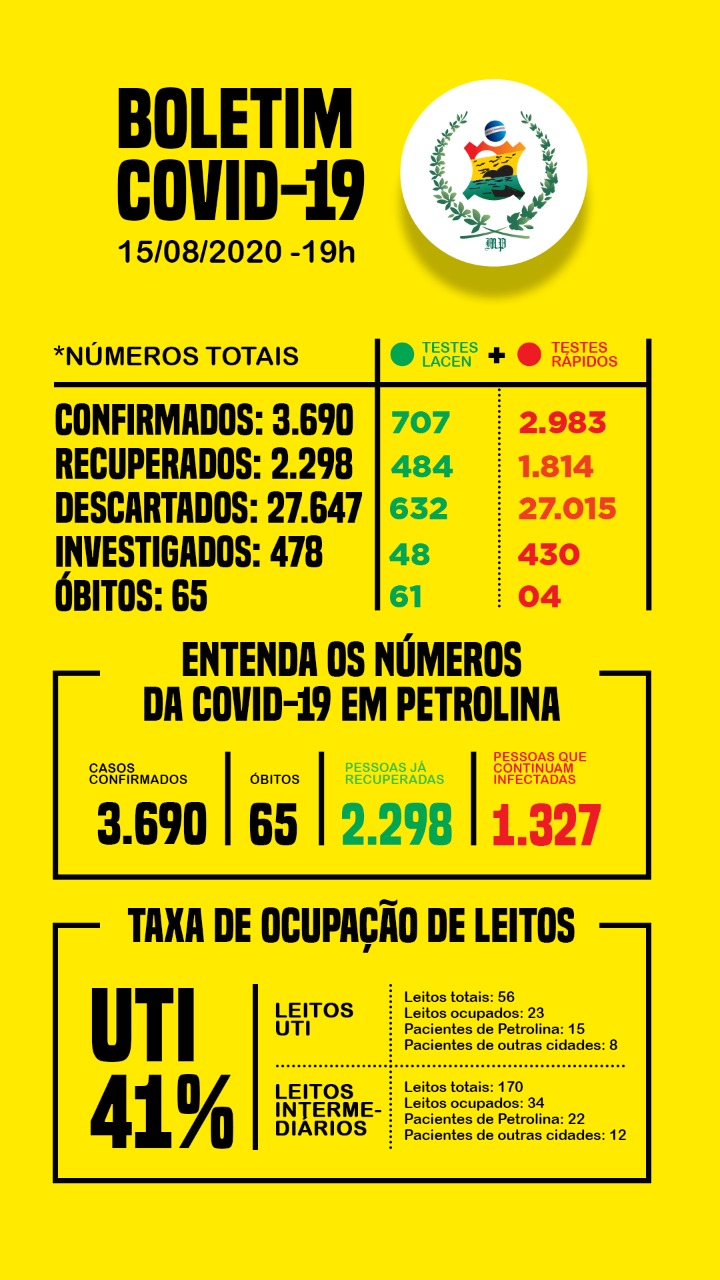 A taxa de ocupação geral dos leitos de UTI da rede pública é de 41%. Dos 56 leitos disponíveis, 23 estão ocupados, sendo 14 por pacientes de Petrolina e 9 de outras cidades da região. Os dados completos podem ser acessados no link.