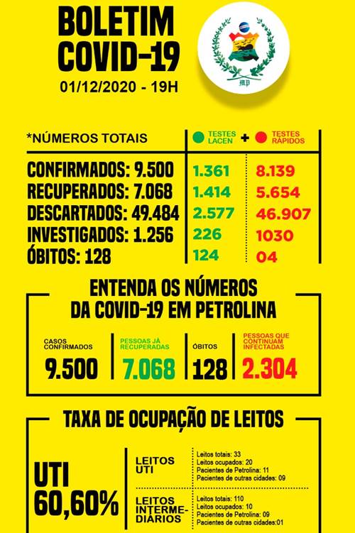 Petrolina chegou nesta terça-feira (1) a 9.500 casos positivos do novo coronavírus (Covid-19), após a confirmação de mais 88 infectados. Os números estão no boletim epidemiológico atualizado pela Secretaria Municipal de Saúde (SMS). Em contrapartida houve 38 curas clínicas, elevando agora o total de recuperados para 7.068.