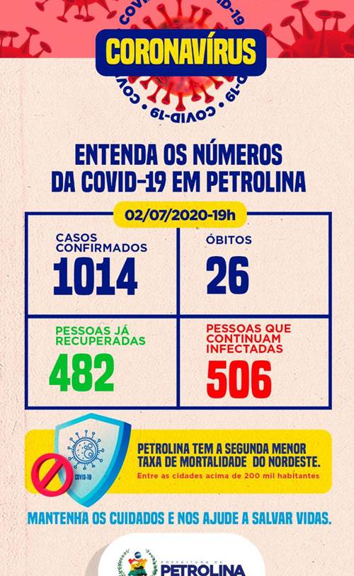 Como já era previsível, Petrolina atingiu 1.014 casos confirmados do novo coronavírus (Covid-19), conforme boletim atualizado da Secretaria Municipal de Saúde (SMS), nesta quinta-feira (2). Foram realizados 377 testes rápidos, resultando em mais 37 infectados. Destes, 23 são do sexo feminino com idades entre 3 e 67 anos, e 14 do sexo masculino, entre 19 e 75 anos. A pasta ainda confirmou 8 resultados positivos de exames laboratoriais: 5 pacientes do sexo masculino, entre 42 e 66 anos, e 3 do sexo feminino – de 28, 36 e 45 anos.