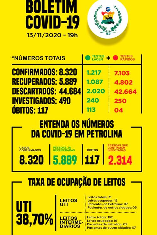 A taxa de ocupação geral dos leitos de UTI da rede pública é de 38,70%. Dos 31 leitos disponíveis atualmente, 12 estão ocupados, sendo 7 por pacientes de Petrolina e 5 por aqueles de outras cidades da região. Os leitos de UTI da rede pública de Petrolina permanecem reduzidos em quase 50% porque o hospital de campanha do governo do Estado ainda não reativou seus 20 leitos que foram desativados por conta das recentes chuvas, e 10 leitos da Policlínica do Hospital Universitário (HU) também não estão funcionando no momento.