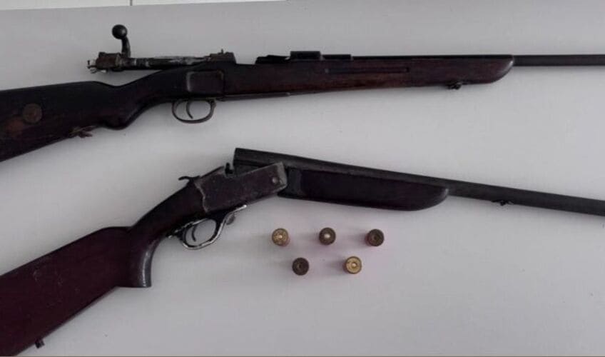 De acordo com informações da corporação, os policiais avistaram dois homens em uma motocicleta em atitude suspeita. Ao perceberem a aproximação da viatura, o condutor fez um retorno brusco e entrou em uma estrada de terra. Durante o acompanhamento, os policiais notaram que o passageiro jogou uma bolsa às margens da via. Ao retornarem ao ponto indicado, encontraram dentro da bolsa uma espingarda calibre 12, com cinco munições do mesmo calibre, além de uma espingarda calibre 28.