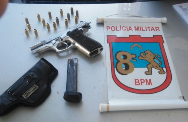 Além da pistola, os policiais encontraram um carregador, 17 munições do mesmo calibre da arma e um coldre. O proprietário mora no município de Ouricuri (PE), no Sertão do Araripe, e foi encaminhado à delegacia de Salgueiro. Ele foi autuado em flagrante delito por porte ilegal de arma de fogo. (Foto: divulgação)