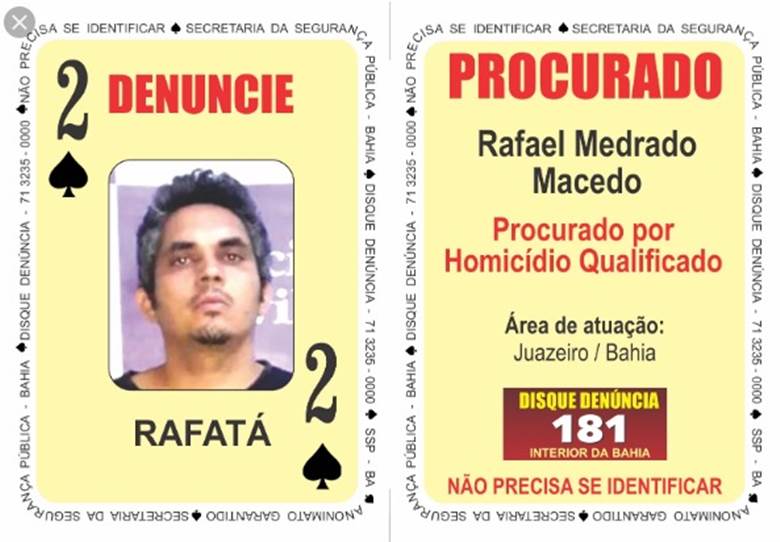 Ele é acusado pelo assassinato de Iata Anderson dos Santos, o qual foi alvejado a tiros no Bairro Jardim São Paulo. Rafatá também estava sendo investigado pela Delegacia de Homicídios de Juazeiro por outras participações criminosas semelhantes. Ele é Carta do Baralho do Crime, da Secretaria da Segurança Pública da Bahia (SSP-BA), sendo o dois de Espadas. A prisão foi concretizada após execução de trabalho do Núcleo de Inteligência do Depin, que A forneceu as informações da localização do procurado, possibilitando a atuação policial naquele Estado.