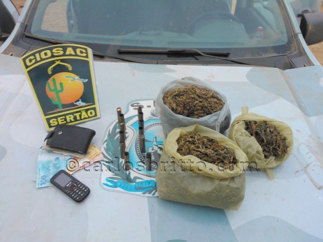 Em Dormentes, policiais militares da Companhia Independente de Operações e Sobrevivência em Área de Caatinga (Ciosac), em ação conjunta com o 5º BPM, prenderam Laércio Leônidas Ferreira, de 30 anos, com um quilo de maconha, 12 cartuchos calibre 32 e a quantia de R$ 305 (foto).