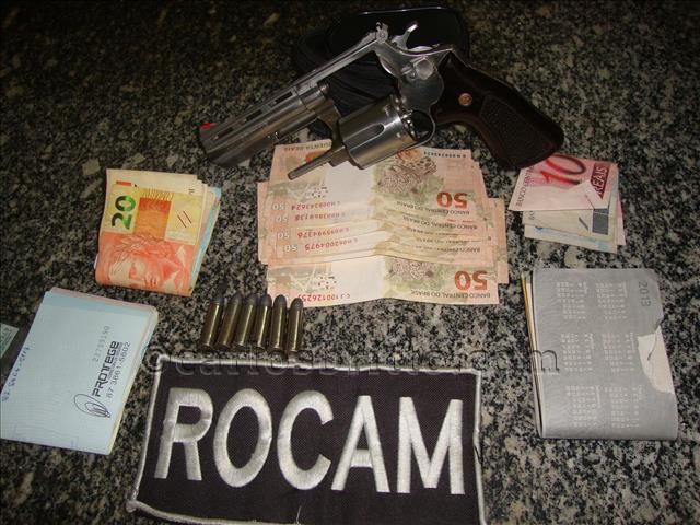 Dentro do veículo, embaixo do banco do motorista, foi encontrado um revólver calibre 38, com seis munições. Além disso a polícia também encontrou uma carteira com a quantia de R$19, mais 11 cheques com valor total de pouco mais de R$ 21 mil, outra carteira com R$ 1.382, vários cartões de credito, uma jaqueta e um colete sinalizador.