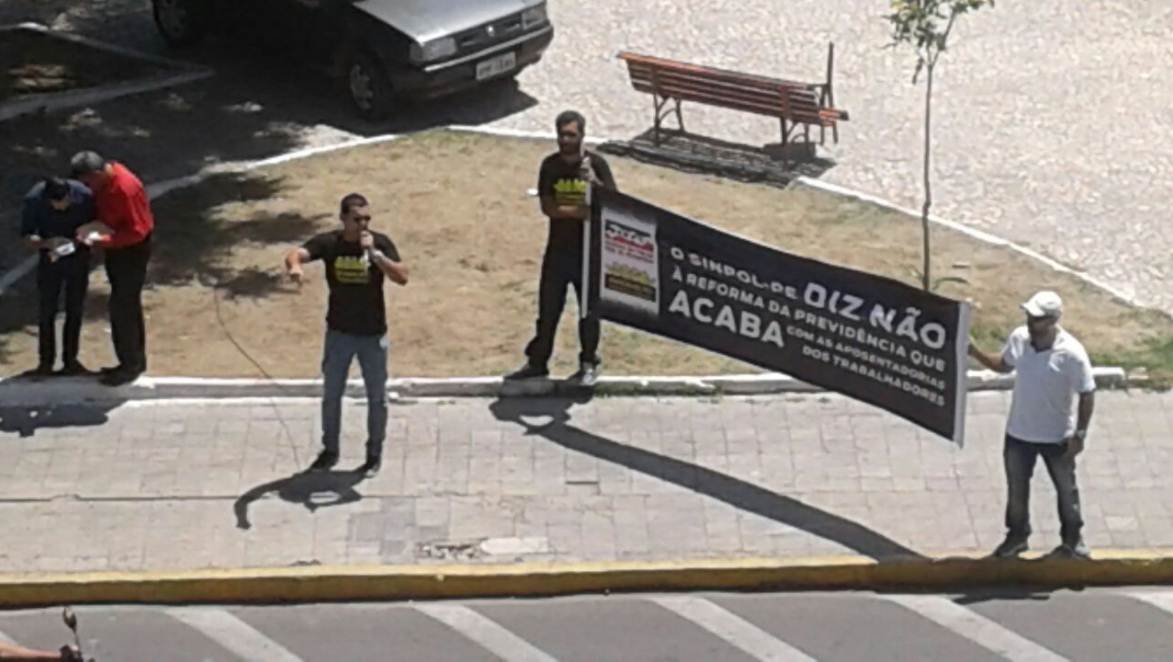 Os manifestantes, que fazem parte do Sindicato dos Policiais Civis do estado (Sinpol-PE), são contra a reforma da previdência. Eles estão segurando uma faixa na qual está escrito que “a reforma da previdência acabará com a aposentadoria dos trabalhadores”.