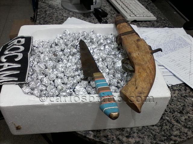 Uma das balas chegou a atingir a viatura dos PMs, que reagiram e conseguiram afugentar os elementos. Eles conseguiram se evadir por um matagal nas proximidades, mas deixaram pelo caminho uma faca peixeira, uma espingarda de fabricação caseira e um pacote com 750 trouxinhas de maconha pronta para o consumo.
