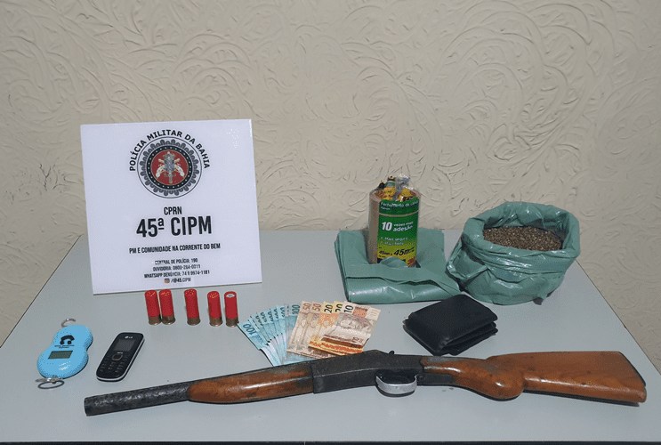 Durante a aproximação policial, foi identificado um homem, a bordo de uma motocicleta Honda, modelo NXR 150 BROS ES, em atitude suspeita. Ao perceber a presença da polícia, empreendeu fuga. A moto foi localizada na frente de uma residência. Após busca veicular, foi encontrada uma embalagem com 1,3 Kg de semente de maconha. Em seguida as guarnições iniciaram a busca no imóvel, onde foram encontrados: 1 espingarda calibre 12, 5 munições de calibre 12, embalagens para acondicionamento de drogas, 1 balança, 1 celular da marca LG, 1 carteira com documentos e a quantia de R$ 1.050 em espécie.