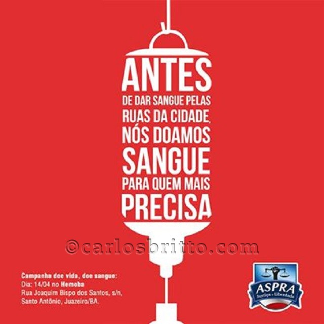 Aspra Regional/Juazeiro (Associação de Policiais e Bombeiros e seus Familiares do Estado da Bahia) realiza campanha, em comemoração ao aniversário de um ano da entidade, “Doe sangue doe vida”, no dia 14 de abril, às 8 horas.