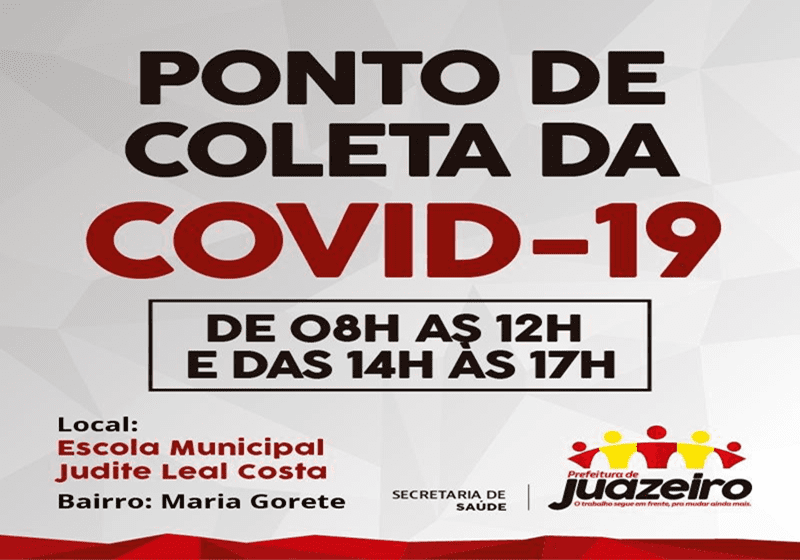 A Vigilância em Saúde de Juazeiro (BA) está implantando um ponto de coleta na Escola Municipal Judite Leal Costa, bairro Maria Gorete, com teste rápido para pacientes que estejam há pelo menos 10 dias com sinais ou sintomas gripais, notificados nos postos de saúde da cidade ou pelo Call Center, através do WhatsApp (74) 9 9819-3089. O local irá funcionar de segunda a sexta-feira, exceto feriados, das 8h às 12h e das 14h às 17h.