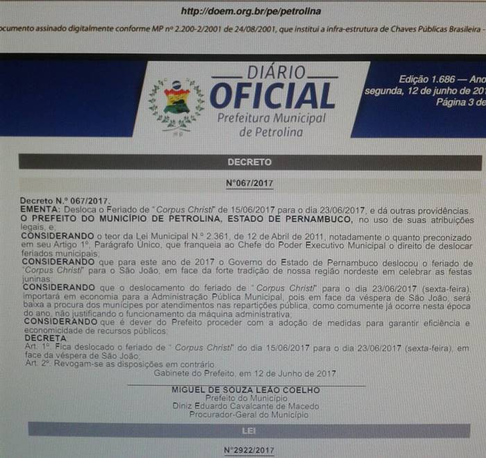 Por meio de decreto, o gestor transferiu a data do feriado, que neste ano cairia na quinta-feira (15), para o próximo dia 23 de junho. A decisão de Miguel Coelho já está, inclusive, no site da prefeitura (www.petrolina.pe.gov.br).