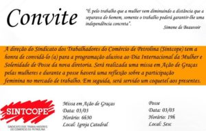 A posse da nova diretoria do Sindicato dos Trabalhadores do Comércio de Petrolina (Sintcope) acontecerá nesta sexta-feira (3). A solenidade acontecerá no Sesc, a partir das 19h.
