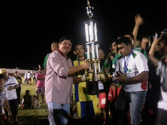Ao fim da partida, Roniere e o presidente da Liga Municipal José Lusinaldo, entregou o troféu ao time campeão, o Vila Nova. o vice campeão foi o Ramalat (de Lagoa de Fora). (Foto/divulgação)