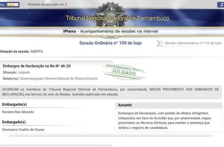 O Tribunal Regional Eleitoral de Pernambuco (TRE-PE) decidiu, por unanimidade, manter a sentença que deferiu o registro da candidatura de Geomarco Coelho (PSB), ao contrário do que queria Roniere, que foi derrotado pelo socialista nas eleições municipais deste ano.