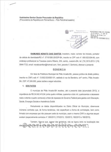 Em Pilão Arcado, no Norte da Bahia, o ex-candidato a prefeito Raimundo Nonato, o ‘Mundoca’ (PPS) decidiu acionar o Ministério Público Federal (MPF) em Petrolina contra o atual gestor, João Porfírio, o ‘Joãozinho’ (PSD).