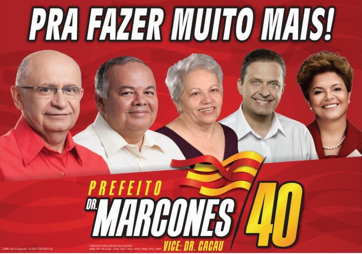 Parece que a assessoria da campanha de Marcones Sá não disse a ele que a direção nacional do PT proibiu o uso da imagem de Dilma e do ex-presidente Lula, a não ser por candidatos a prefeito do Partido dos Trabalhadores.